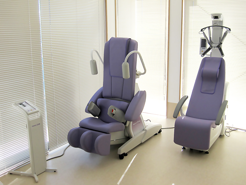 すわる姿勢から牽引治療が行えるため、乗り降りが容易で最新式の足部ホールドマッサージ機能も備えております。 背骨を周期的に牽引することで、椎間板の除圧と筋、靭帯へのマッサージ様効果が得られ、神経の圧迫症状を和らげます。
